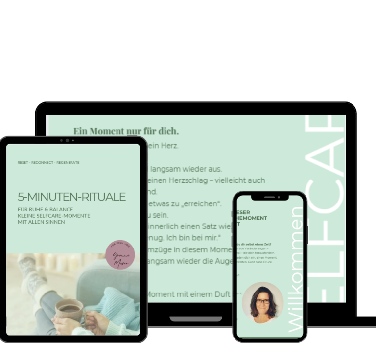 Ich weiß, wie leicht wir im Alltag zwischen Beruf, Familie und Verpflichtungen selbst untergehen können. Darum habe ich die 5-Minuten-Rituale entwickelt – kleine Impulse, die dir helfen, wieder mehr bei dir anzukommen.